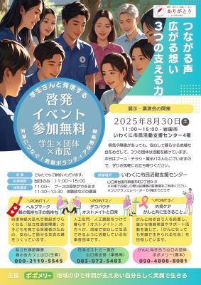 「病気」を正しく知って、正しく伝える〜患者さんの暮らしを支える情報発信〜 ポポメリーでは、患者さんの暮らしを支える情報発信として啓発活動を岩国市でイベントを開催します。 山口県の『未来につなぐ!若者ボランティア促進事業』 […]