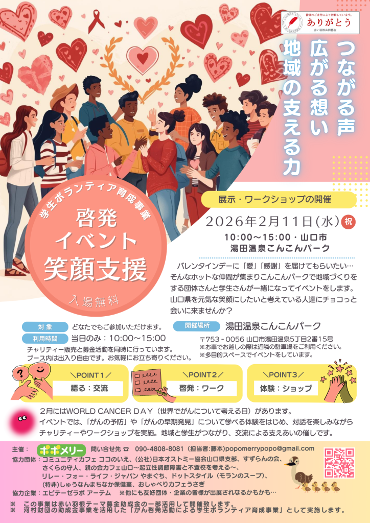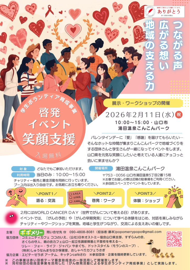 河村芳邦記念青少年育成財団の助成金を活用した『がん啓発活動による学生ボランティア育成事業』として、地域づくりを主体とする市民団体と対話を楽しみながら、学生さんや市民の方と交流できる笑顔支援に繋がる、心が温かくなるイベントを開催します。